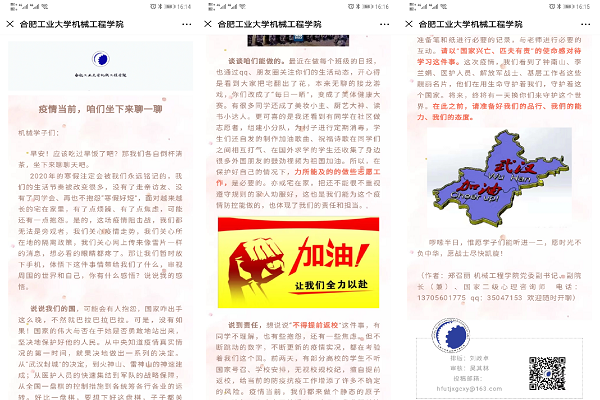 该院党委副书记郑召丽在学院微信公众号上发文《疫情当前,咱们坐下来聊一聊》,与学生通过网络互动“面对面”交流,关心同学们的假期生活,体会同学们面对疫情的心理感受,讨论面对这场疫情阻击战的感悟。她在文章中从“说说我们的国”“谈谈咱们能做的”“说说责任”“聊聊线上教学这件事”几个方面帮同学们答疑解惑,疏解心理压力,合理安排学习生活,同时鼓励同学们积极参与力所能及的志愿活动,号召同学们拿出“国家兴亡、匹夫有责”的使命感,为抗疫付出自己的实际行动。