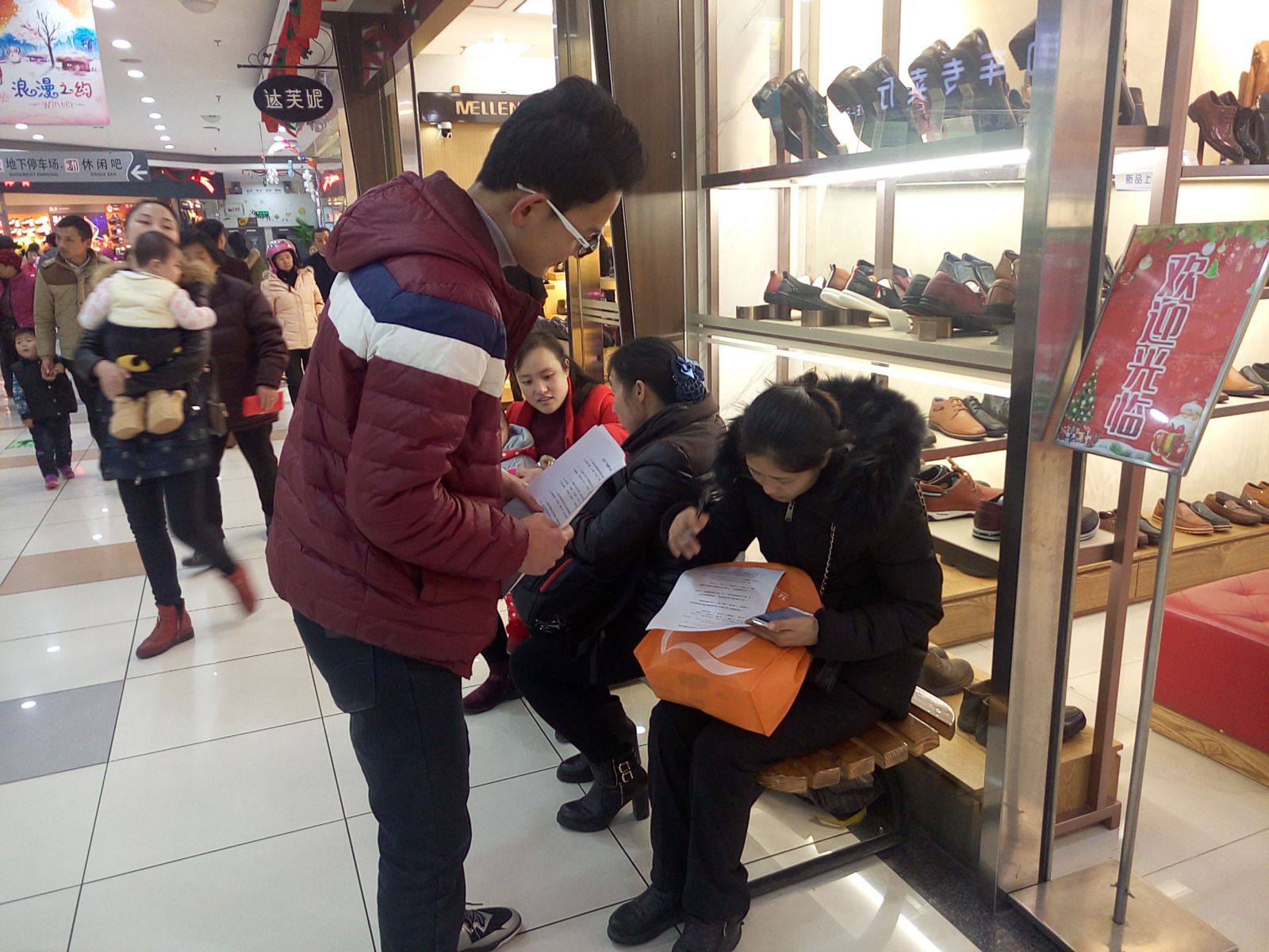 下午两点,积极分子们徒步前往中环城开展活动。此时虽然不是购物的高峰期,但购物中心中的人仍然很多,面对同学们的热情搭讪,来往群众显得极为配合,在同学们帮助下认真地完成调查问卷的每一个问题。与此同时,同学们也积极地为大家讲解党的最新政策,宣传十八届六中全会精神,吸引许多行人驻足观看。在活动中,时有群众对问卷内容不了解,或提出其他问题,同学们都一一耐心解答。
