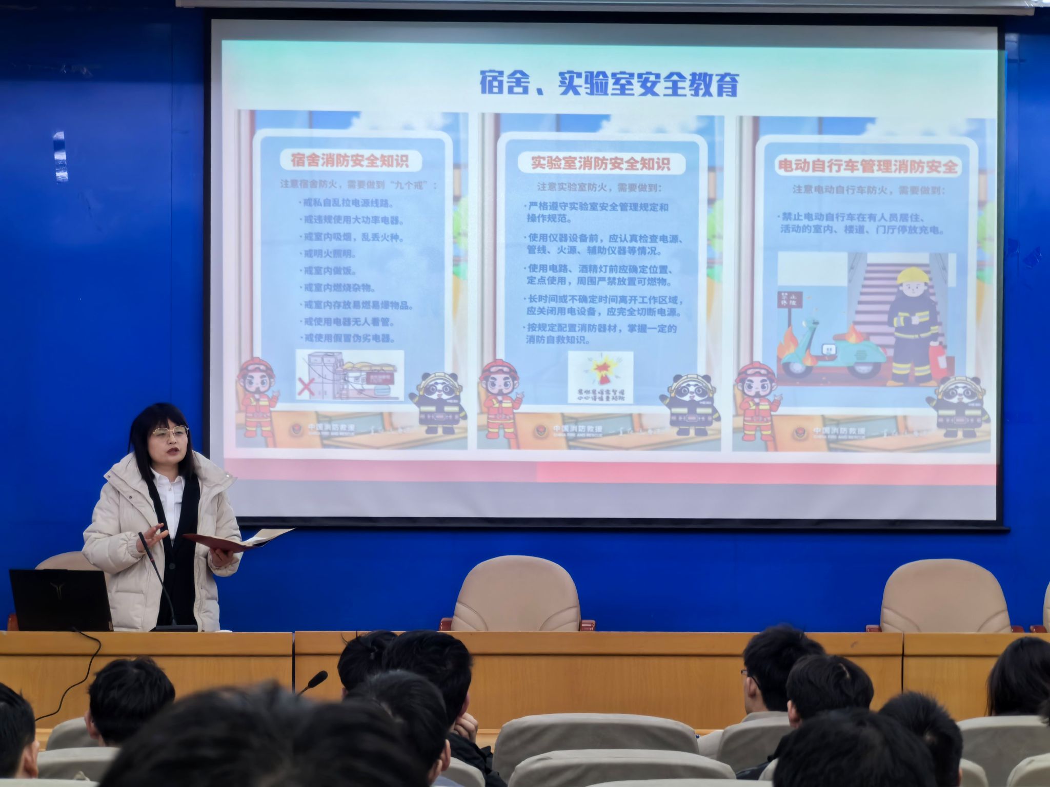 学院通过专题会议布置、消防安全主题班会及宣传消防安全海报等多种形式,全方位、多角度地普及消防安全知识。主题会议上,辅导员结合实际案例,通过播放视频、图片等形式,展示火灾的严重性和破坏性,让学生深刻认识到消防安全的重要性。各学生党支部也组织相关活动,将学生消防安全教育纳入支部的常态化工作中。