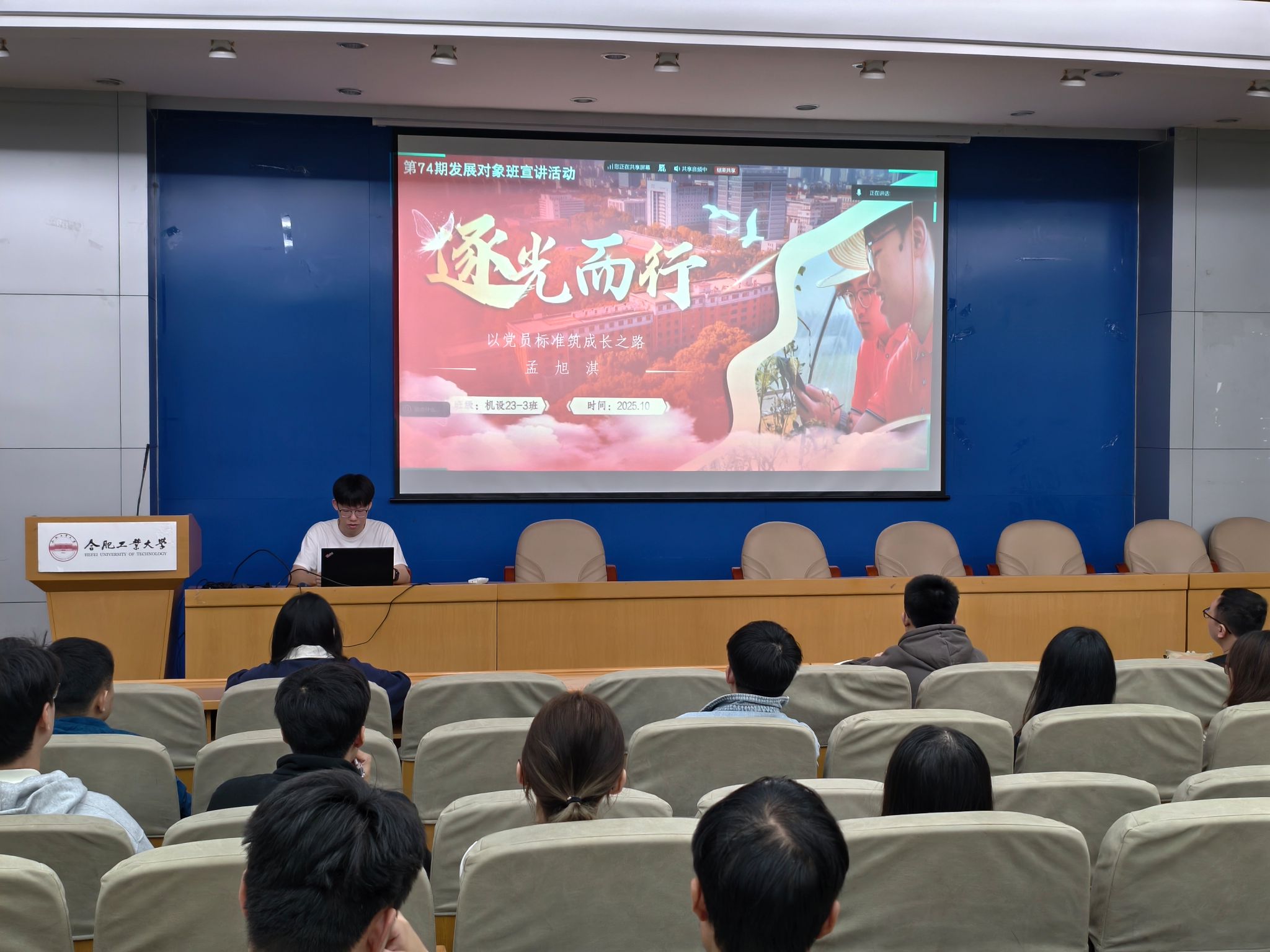 10月15日,必赢线路检测3003第74期发展对象班举办了以“榜样力量引前行,赤诚初心向党心”为主题的研讨交流会。活动邀请中共预备党员、校十佳社会公益标兵孟旭淇同学作专题分享,旨在通过榜样的引领作用,激励全体学员坚定理想信念、锤炼能力本领,以实际行动积极向党组织靠拢。