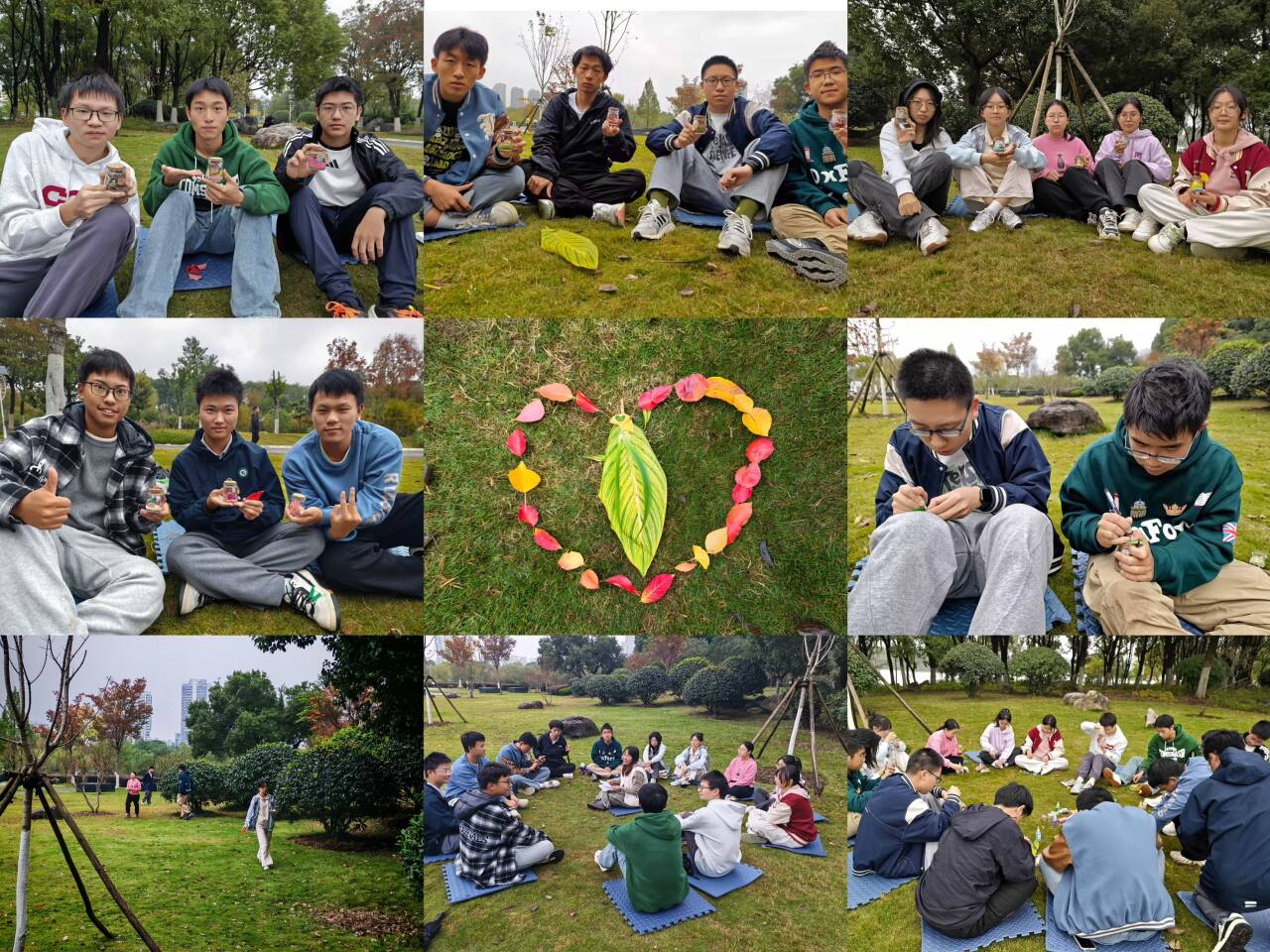 本次活动设置了“破冰、手作、静观、分享”四个环节。在“我的情绪落叶”破冰活动中,同学们在公园中寻找最能映照当下心情的落叶,并通过自我介绍与选择落叶原因的分享,迅速拉近距离。随后,大家将收集的落叶共同拼成爱心图案,以集体合影定格温暖的瞬间。在“立冬押花许愿瓶”手作环节,同学们依次将细沙、泥土、落叶、干花与写有心愿的纸条分层装入瓶中,借由象征性的创作过程表达情绪,调节当前的状态,也寄托了对未来学习与生活的美好愿景。活动中,陈紫燕带领同学们进行“立冬正念呼吸”练习,引导同学们在宁静的呼吸间关注当下、接纳自我。活动尾声,同学们围坐在一起,分享参与感受,大家纷纷表示在自然与创作的氛围中获得了有效的压力释放与情绪调节。