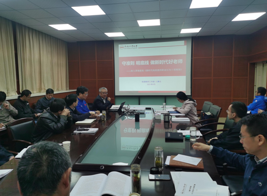 学院党委书记陈科作了《守准则 明底线 做新时代好老师》师德师风建设专题报告,重点传达学习了师德重要规范和制度,通报教育部公开曝光的典型案例,明确指出全体教师要始终做到讲政治、守规矩,对党忠诚,增强“四个意识”,坚定“四个自信”,做到“两个维护”,努力做新时代“四有”好老师。他强调,思想政治工作是党的优良传统、鲜明特色和突出政治优势,是一切工作的生命线。全院教师要始终把思想政治工作摆在第一位,始终坚持马克思主义立场和观点,加强思想政治理论学习,不断提升政治素养和政治站位,全面落实立德树人根本任务。同时,加强思想政治工作要与师德师风建设紧密结合起来,将师德师风建设作为学院师资队伍建设的长期任务,要抓牢抓实,抓严抓狠,努力提升学院师资队伍师德水平和业务素质,落实师德失范行为“一票否决”。