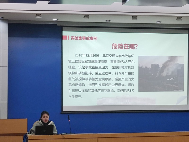 汽车与交通学院的20级博士贺泽佳同学,主要从实验室安全事故案例、实验室安全基础知识两个方面介绍,并着重介绍了实验常规防护方法及事故应急措施,内容简明扼要,针对性和可操作性强,提醒大家做好实验前的准备工作,严防安全事故的发生。