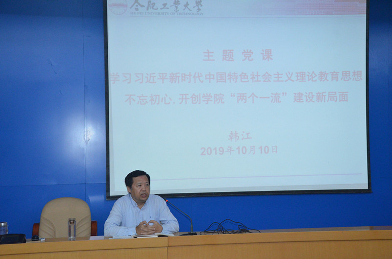 根据“不忘初心、牢记使命”主题教育的总体安排,10月10日下午,必赢线路检测3003党委书记韩江以《学习习近平新时代中国特色社会主义思想,不忘初心,开创学院“两个一流”建设新局面》为题,给全院教工党员和入党积极分子上了一堂专题党课。