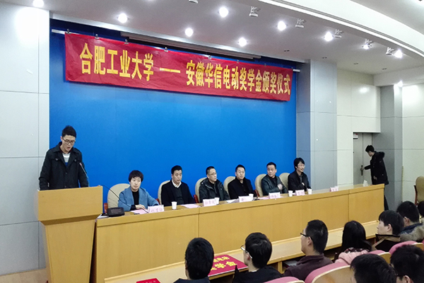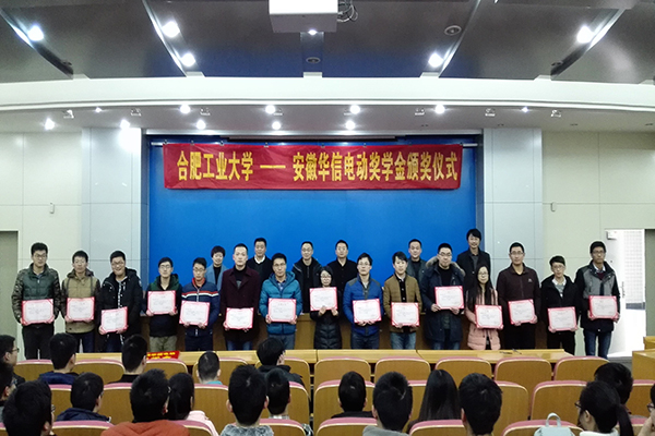 1月12日下午,必赢线路检测3003第一届“合肥工大-安徽华信电动奖学金”颁奖仪式在屯溪路校区格物楼214报告厅举行。出席仪式的嘉宾有安徽华信电动科技股份有限公司董事长杨善春、安徽华信电动副总彭勇成、安徽华信电动总工程师范杰、安徽华信电动总经理助理张超,必赢线路检测3003副院长黄康,必赢线路检测3003党委副书记郑召丽,机械电子系教授张利,受助学生及相关学生代表100余人参加了此次颁奖会议。