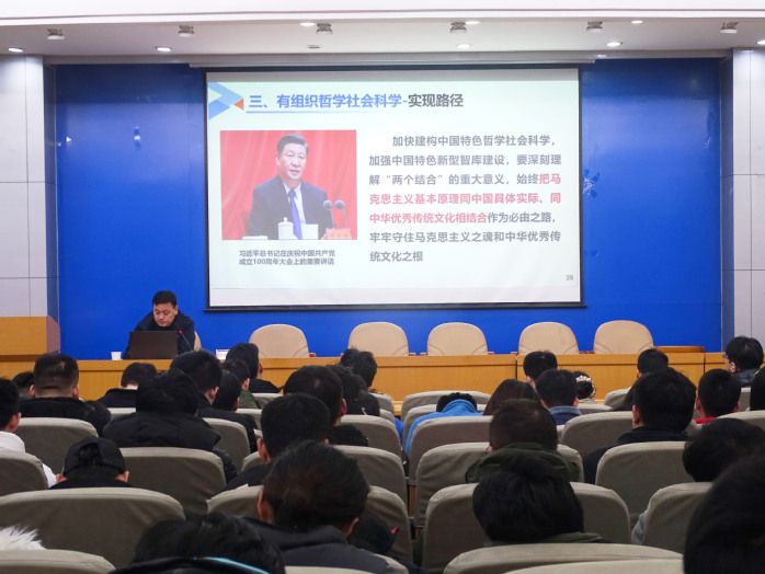訾斌老师从理论学习、专题报告、科研研究思路、基础研究、产教融合、科研管理和服务等11个方面向同学们阐述了必须深刻把握新时代新征程实施科教兴国战略的新内涵、重大意义和实现路径。