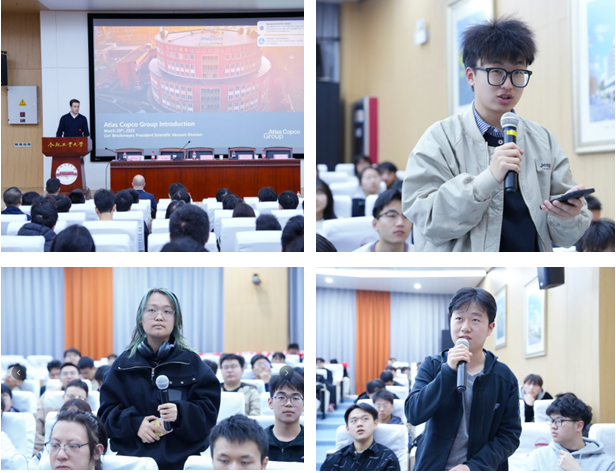 Carl总裁为同学们带来了一场精彩纷呈的演讲,他深入浅出地阐述了真空技术在现代工业中的广泛应用,从半导体制造到新能源领域,从食品包装到航空航天,真空技术无处不在且至关重要。他还分享了阿特拉斯科普柯集团在科技创新和可持续发展方面的先进理念与丰硕成果,鼓励同学们勇于探索、敢于创新,积极投身真空事业,为行业发展贡献力量。此外,Carl总裁分享了自己的职业生涯,为同学们带来更多鼓励,并欢迎同学们加入阿特拉斯科普柯集团。
