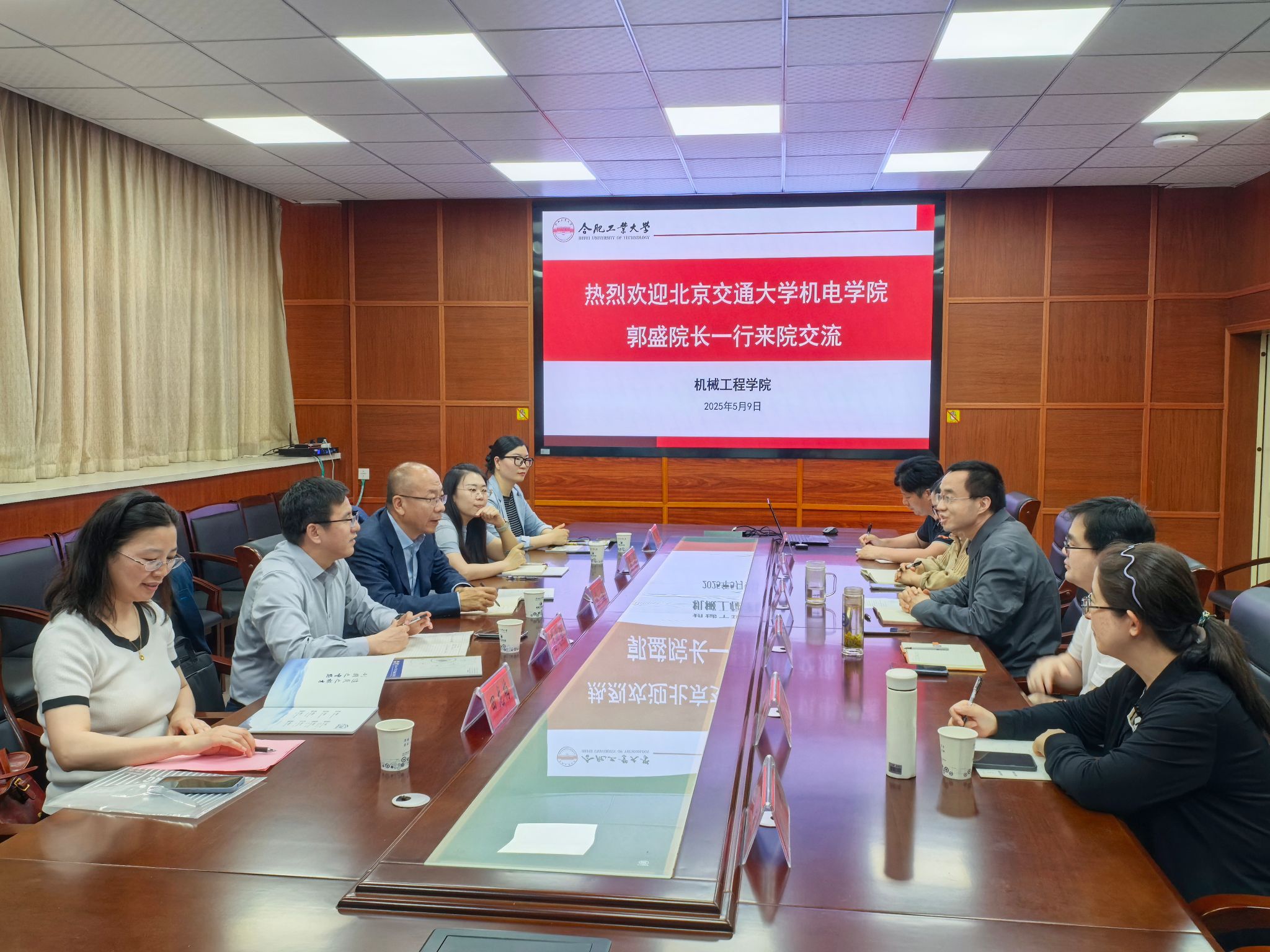 2025年5月9日下午,北京交通大学机械与电子控制工程学院院长郭盛、副书记副院长蒋增强、副书记唐薇、测控系主任董立静、研究生科科长田龙梅一行莅临我院调研交流工作。学院党委书记祖磊,副院长马培勇、赵萍,党委副书记兼纪委书记蔡伟伟,党政办公室主任陈华,党委秘书倪记来参加了交流会。