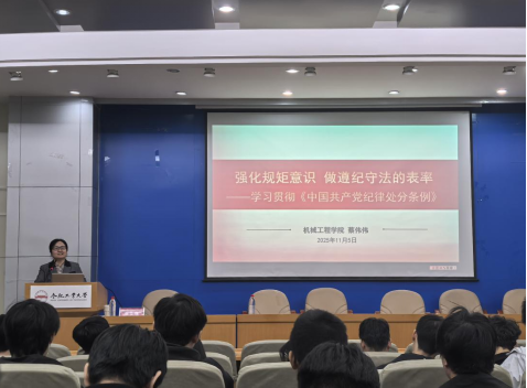 蔡伟伟以“强化规矩意识做遵纪守法的表率”为题开展党纪专题教育,结合《中国共产党纪律处分条例》,从强化规矩意识的重要性、条例核心要义和精神实质、践行遵规守纪要求三方面展开,列举学术不端、网络言行失范等典型案例,深入阐述了违反六大纪律的具体情形与违法纪律的处分等,引导同学们将纪律规矩内化于心、外化于行,在日常学习生活中守行为底线、强化责任担当。