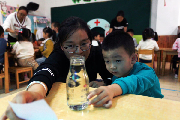 到达幼儿园后,志愿者们通过自我介绍和才艺展示,活跃了气氛,增强了小朋友的积极性,让孩子们以更加轻松的状态进入课堂教学环节。志愿者们带着小朋友开展了《万花筒的制作》、《泡沫实验》、《神奇的水实验》等实验课程,并在实验过程中讲解简单的科学原理。