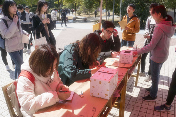 3月6日,必赢线路检测3003“慢递邮局”活动在翡翠湖校区一食堂广场进行,吸引很多同学积极参与。