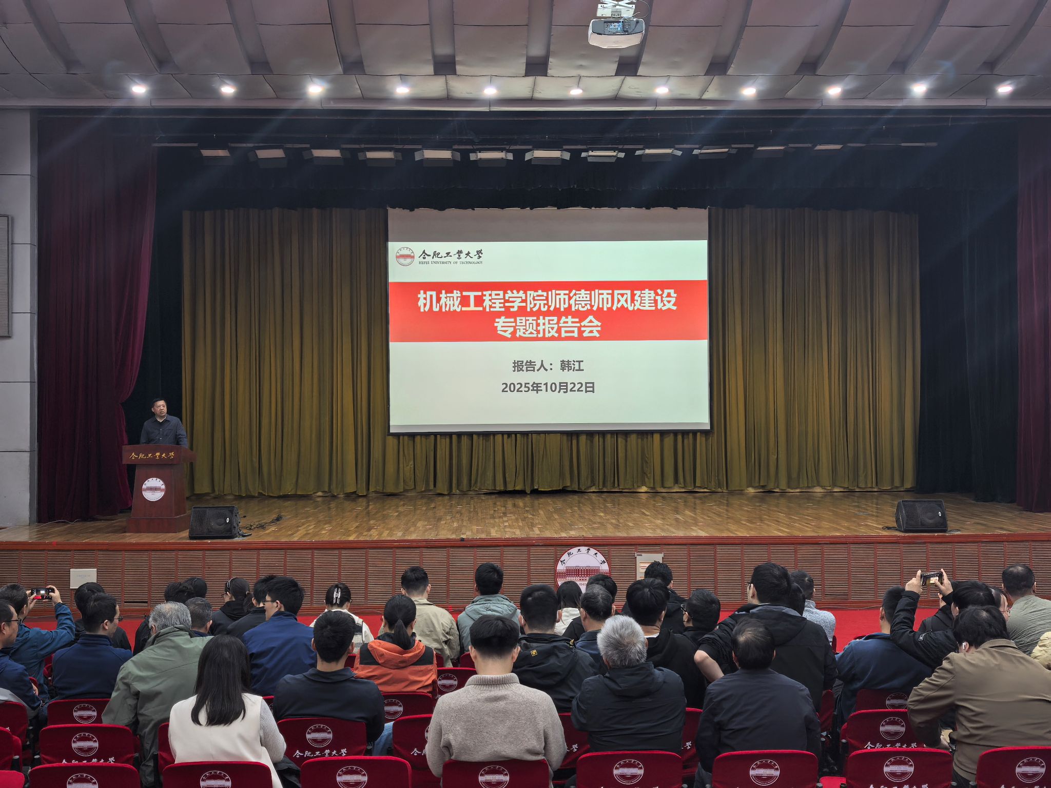 10月22日下午,必赢线路检测3003在斛兵礼堂成功举办了2025年第二场师德师风专题报告会。此次报告会特邀国务院特殊津贴专家、安徽省杰出人才、必赢3003no1线路斛兵学者韩江教授主讲,全院教师集中参加学习。报告会由学院党委副书记兼纪委书记蔡伟伟主持。